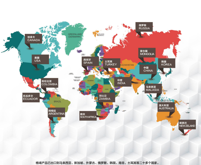 截至2019年,格峰產品已經累計出口到外蒙古 俄羅斯 韓國 哥倫比亞 南非 印度 讚比亞 土耳其等19個國家和地區,格峰在中國大陸的銷售網點1300多個,進駐所有省份,並以年均40%以上速度高速發展。