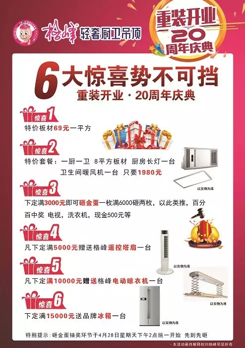 2019年4月8日—28日,格峰輕奢吊頂連雲港專賣店重裝開業,正值格峰品牌20周年慶為活動強勢助力。